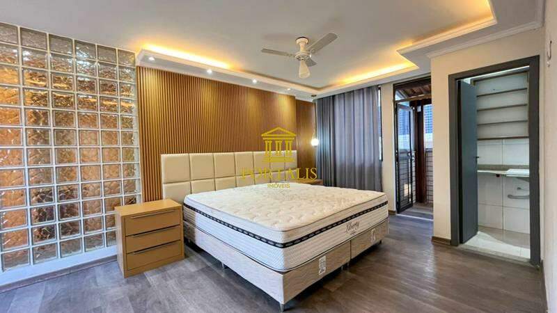 Quarto amplo com teto rebaixado, iluminação planejada e closet, sendo a suíte com varanda, bancada em granito, armários, pia em cuba de apoio, bidê e box em blindex.