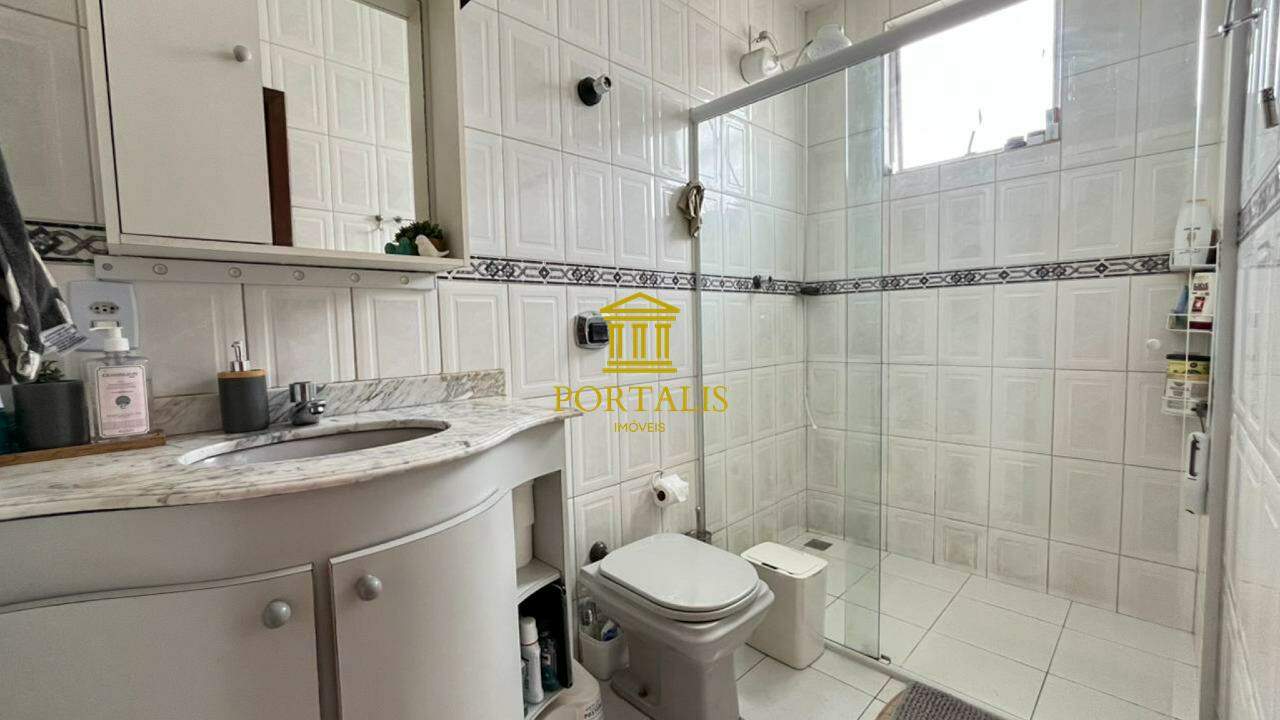 * Banheiro social com bancada em granito, armários e box em blindex